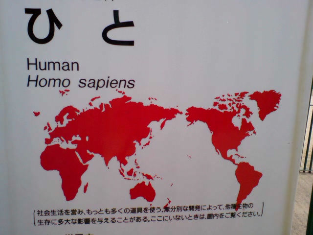 「社会生活を営み、もっとも多くの道具を使う。無分別な開発によって、多種生物の生存に多大な影響を与えることがある。ここにいないときは、園内をご覧下さい」